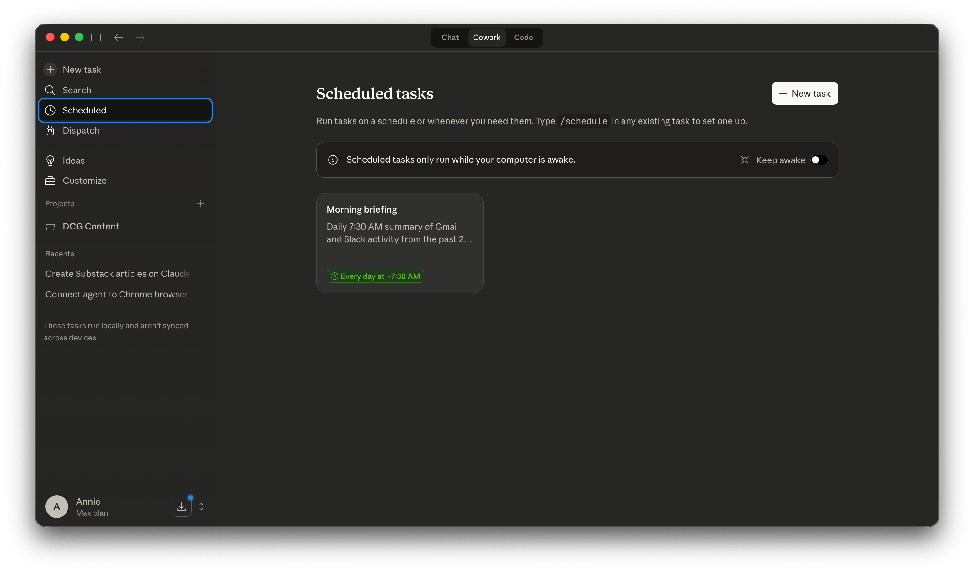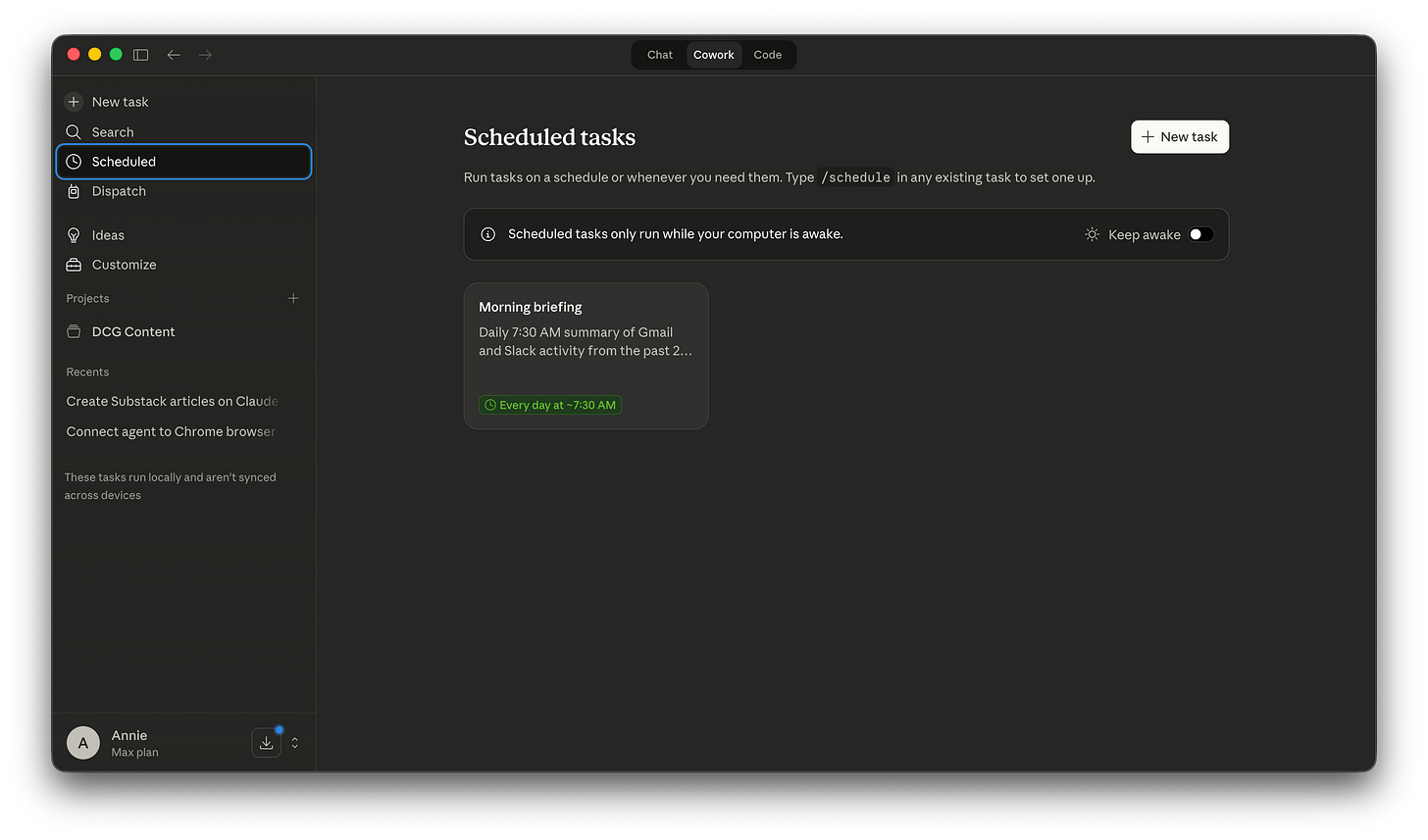 One important detail: there is a note on this screen that says “Scheduled tasks only run while your computer is awake.” If your Mac is closed at 7:30 AM, the task will run the next time you open it. If you want it to run reliably, leave the Keep awake toggle on.
