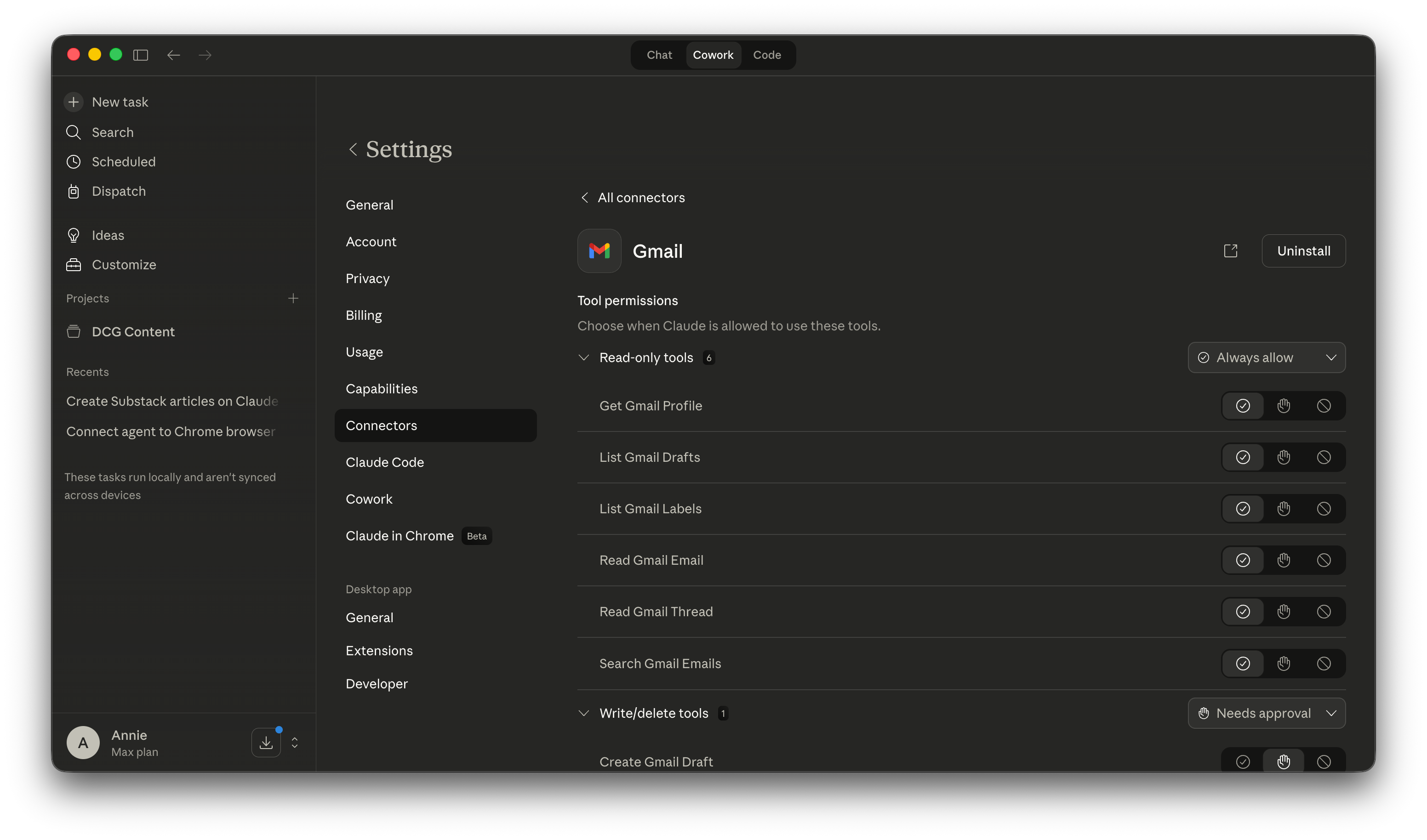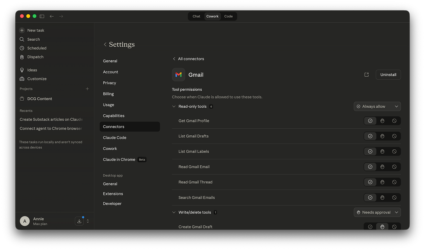 If you click into Gmail, you can see exactly which tools Cowork has access to. The read-only tools are set to Always allow by default. The only write tool is Create Gmail Draft, which is set to Needs approval. This means Claude can never send an email without you explicitly approving it first.