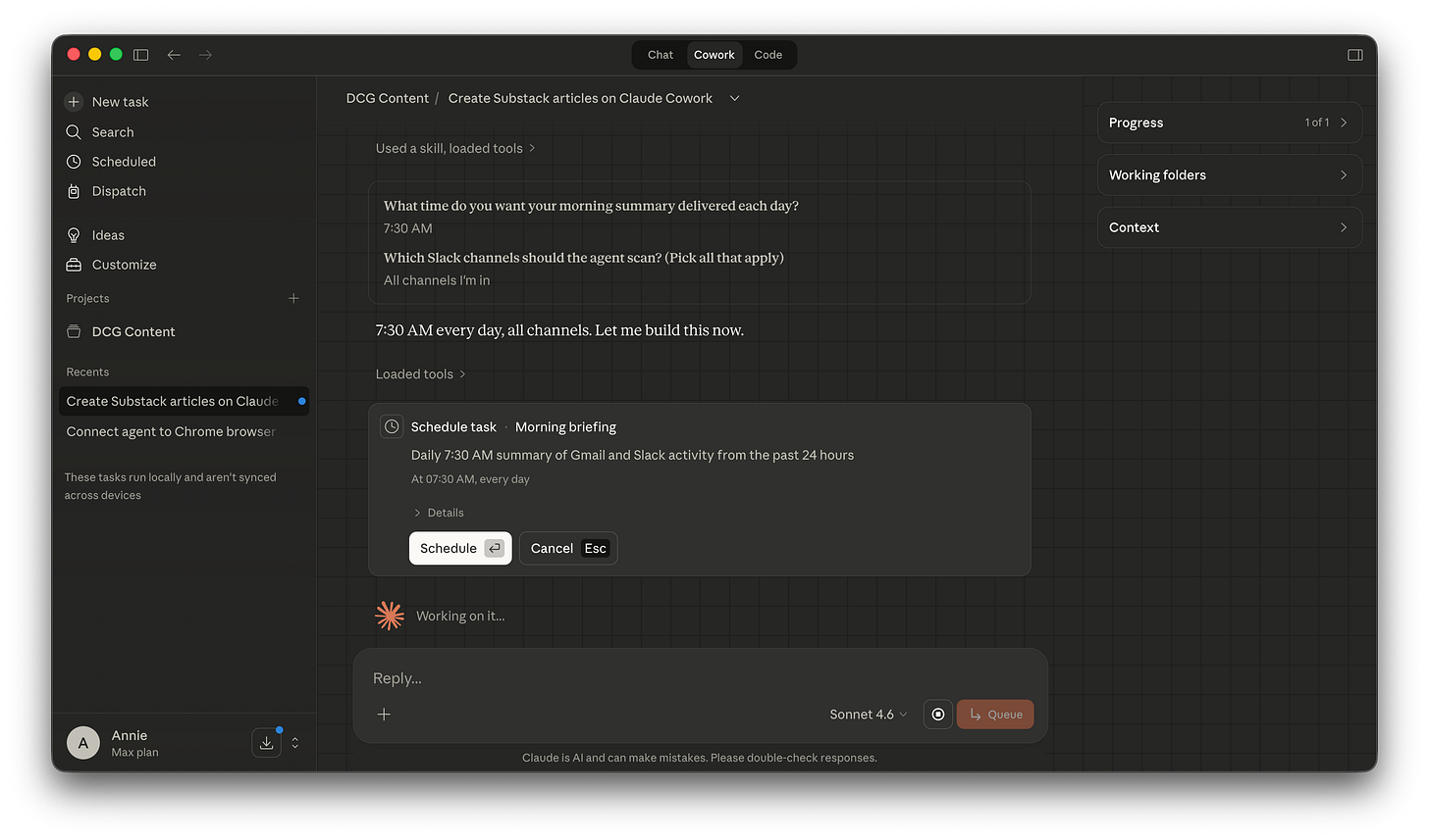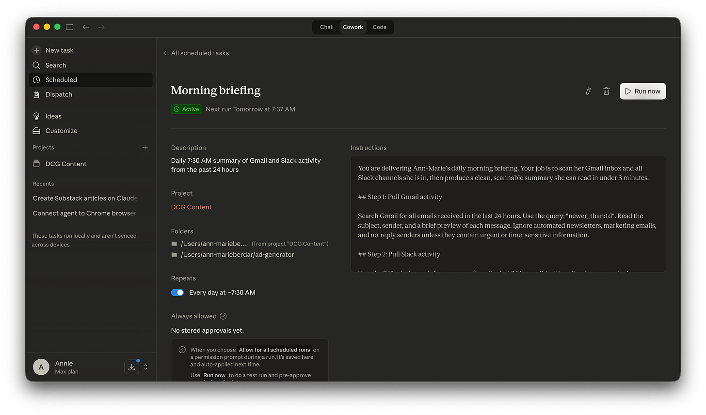 The first time it runs, Cowork may ask you to confirm that it can access Gmail and Slack. Choose Allow for all scheduled runs. After that, it runs fully automatically.