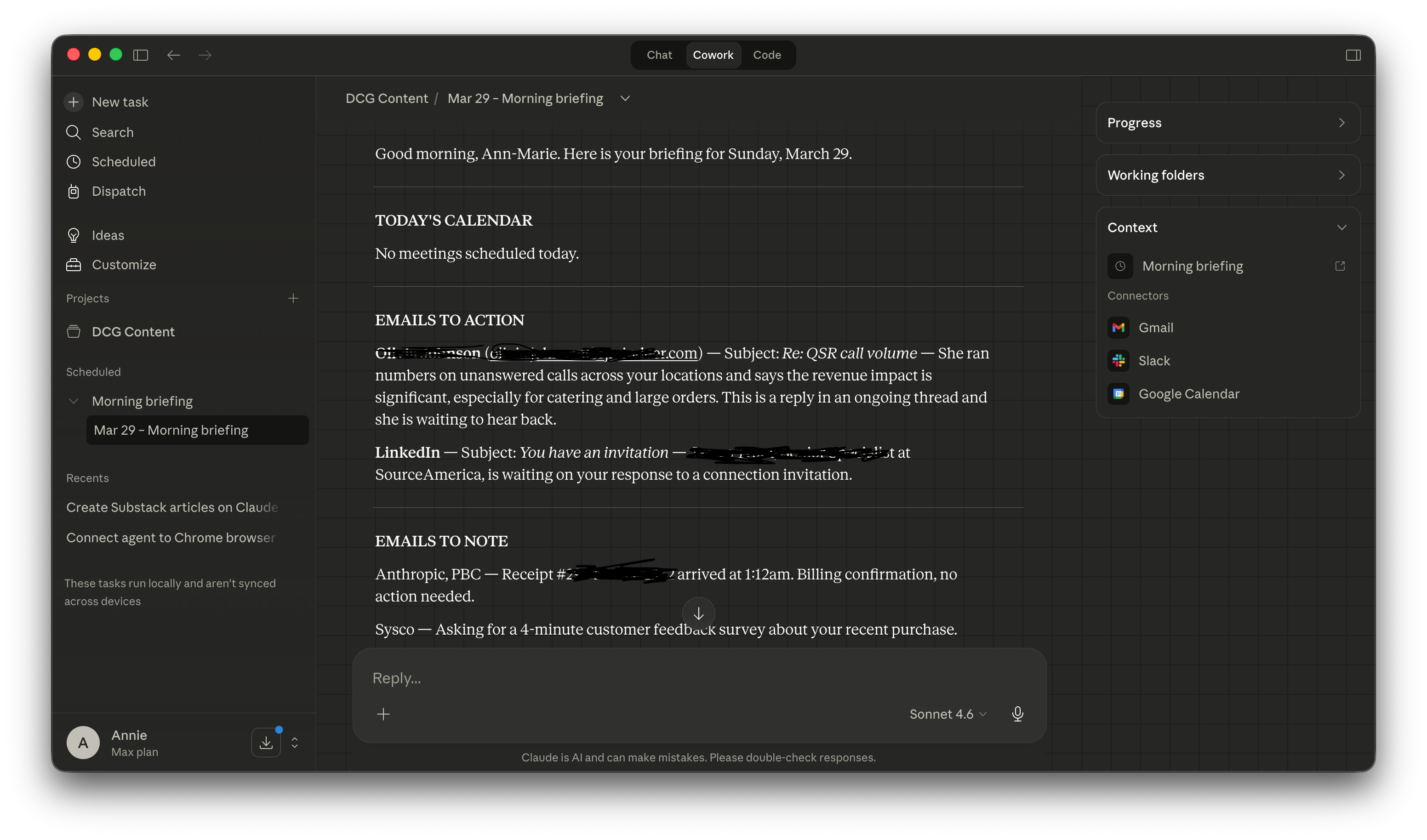 I built a Claude Cowork scheduled agent that does all of that for me every morning at 7:30 AM. It scans my Gmail, reads my Slack channels, checks my calendar, and delivers a clean briefing directly in Cowork before I even pour my first cup of coffee. The whole setup took about 15 minutes.