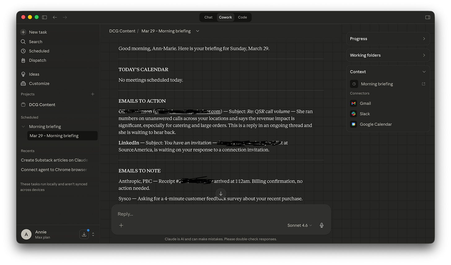 It opened with my calendar for the day, then flagged two emails that needed a response with a one-sentence summary of what each person needed. Below that, two informational emails that were worth knowing about but required no action. Then Slack highlights.